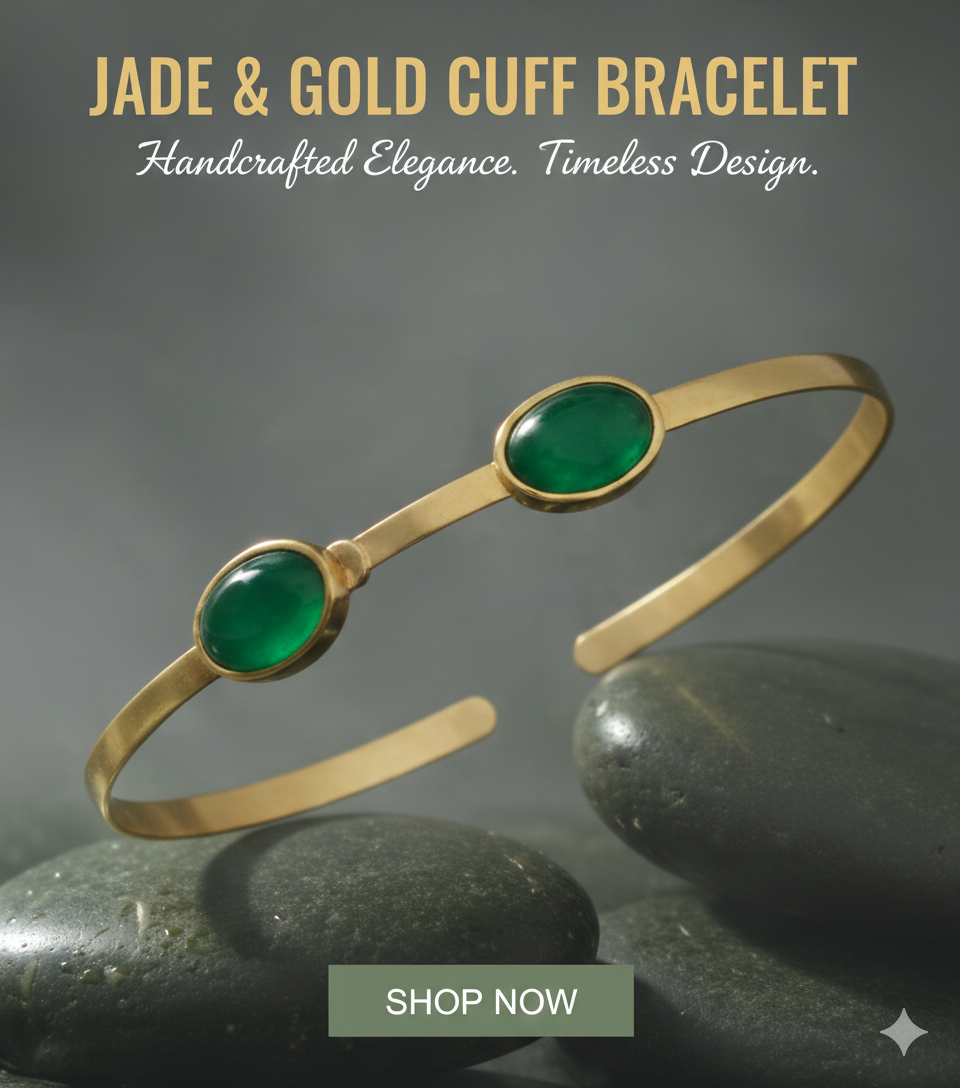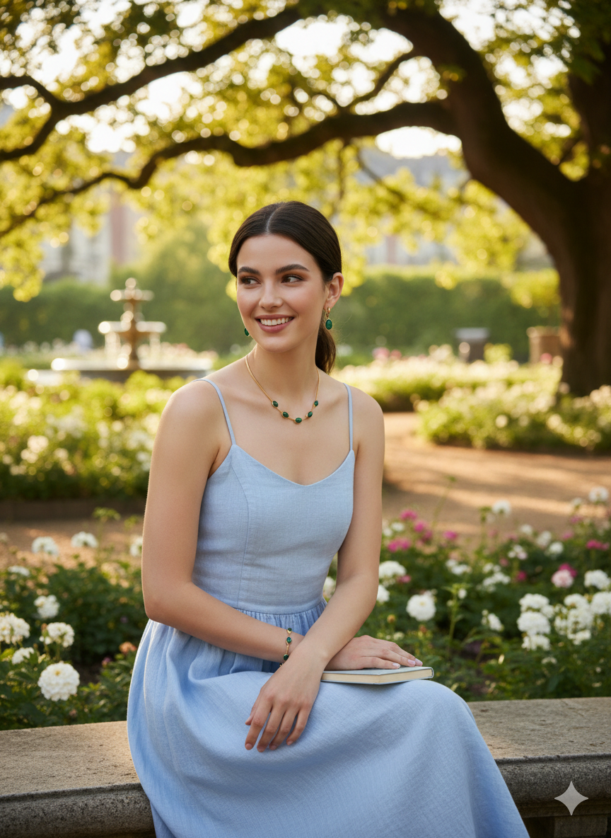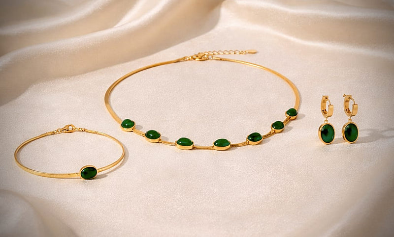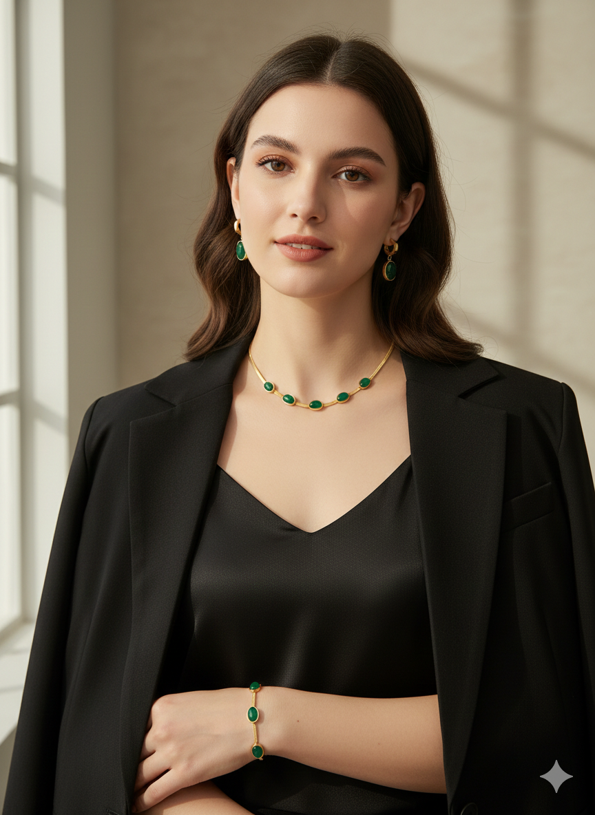 "Zameen ki gehrai aur sone ki nazaakat ka ek haseen sangam. Is set mein gehre hara rang ke 'cabochon' stones ko modern gold curves ke saath piroya gaya hai. Ye jewelry sirf pehnne ke liye nahi, balki apni ek alag pehchaan banane ke liye hai—bold, graceful, aur hamesha ke liye yaadgaar."